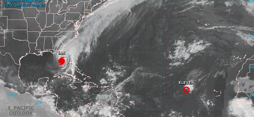 El huracan Ian Tras azotar una parte de la Florida, bajó a categoría 2 con vientos máximos de 169 km/h (105 mph), moviéndose hacia el noreste a 13 km/h (8 mph), según la actualización de las 9:00 p.m. del Centro Nacional de Huracanes de los Estados Unidos.