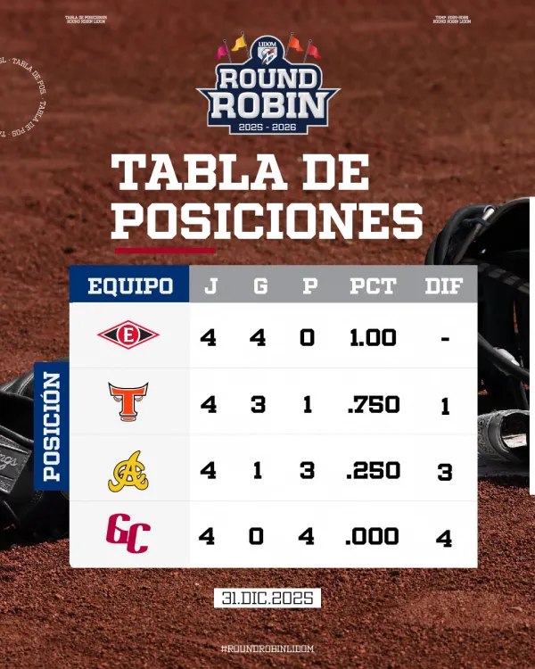 La Liga de Béisbol Profesional de la República Dominicana (LIDOM) cerró el calendario competitivo del año 2025 con la tabla de posiciones del Round Robin claramente definida, tras completarse la jornada del 31 de diciembre.